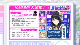 12,375,000人、76位でした。祝、初入賞!いや、まあ全力でお迎えに行ったキャス灯織・キャス千雪さんのおかげなんですけど。とてつもなく嬉しいです。いつだったか、「灯織のpトワコレが来たら本気出す」とは言ってましたが、まあ有言実行できま...